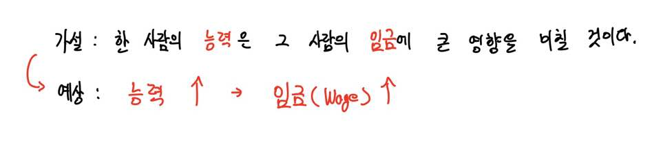 다음 가설에서 독립변수는 능력(Ability)라고 할 수 있으며, 종속변수는 임금(Wage)라고 할 수 있겠죠.