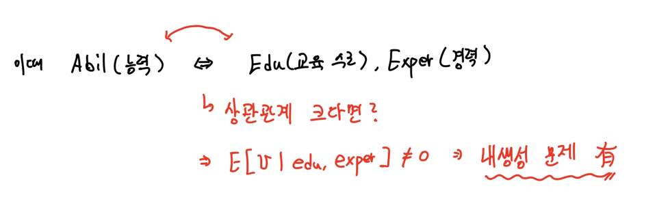 그렇다면 오차항의 조건부 기댓값이 0이 되지 않아 내생성 문제(Endogenous Problem)가 발생합니다.
