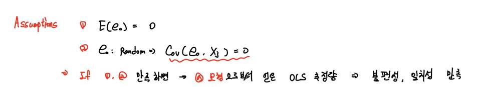 두 번째는 이러한 Error가 랜덤으로, 설명변수 X들과 Uncorrelated 하다는 것이죠.