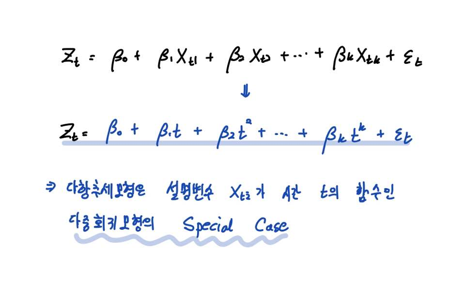 이러한 다항추세모형은 사실 설명변수가 시간 t의 함수인 다중회귀모형(Multiple Linear Regression Model)의 특별한 case입니다.