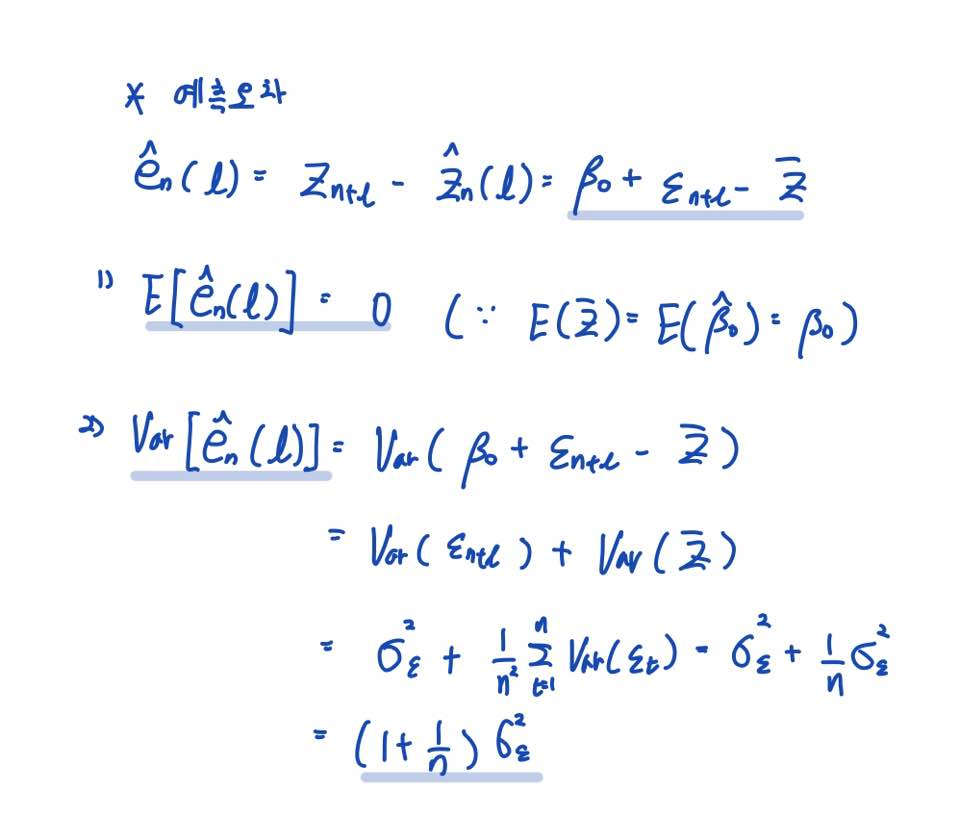 그러므로 l-시차 후의 예측값의 오차인 예측오차 e^ 은 위와 같이 정의할 수 있습니다.