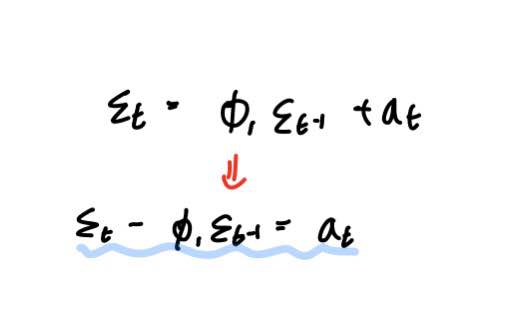 t-시점에서의 AR(1) 식에서 t-1시점에서의 오차항 e_(t-1)에 Φ을 곱해준 Φ*e_(t-1) 을 빼주면
