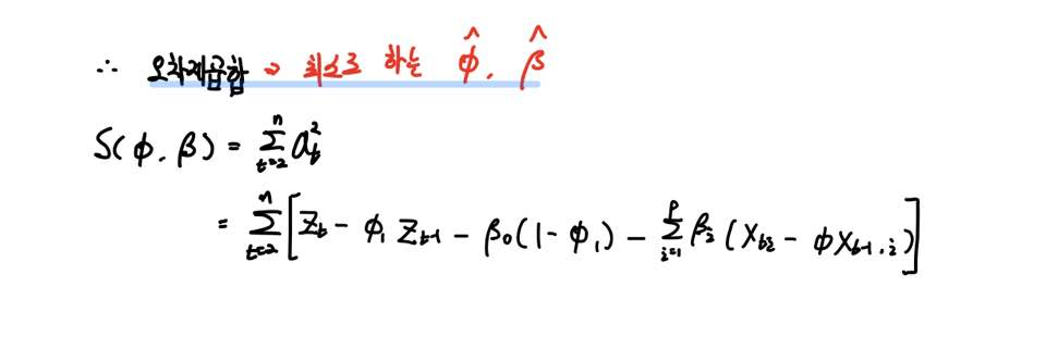 이때의 추정하고자 하는 모수는 자기상관계수인 Φ와, 그리고 다중회귀모형에서의 회귀계수들이 되겠죠.