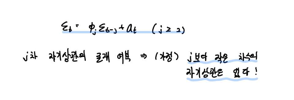 단, 위 모형에서 보는 것처럼 j차 자기상관의 존재 여부를 알아보는 것은 j보다 작은 차수의 자기상관은 존재하지 않는다는 가정하에서만 가능합니다.