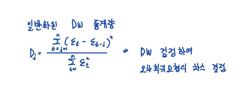 위 식을 j-시차에서의 일반화된 Durbin-Watson 검정통계량이라고 합니다.