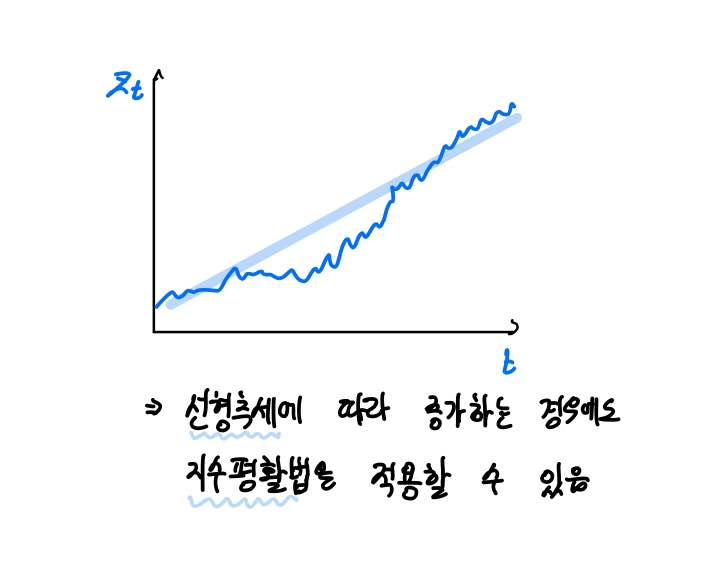 지수평활법은 시계열이 선형추세에 따라 증가하는 경우, 혹은 감소하는 경우에도 적용할 수 있습니다.