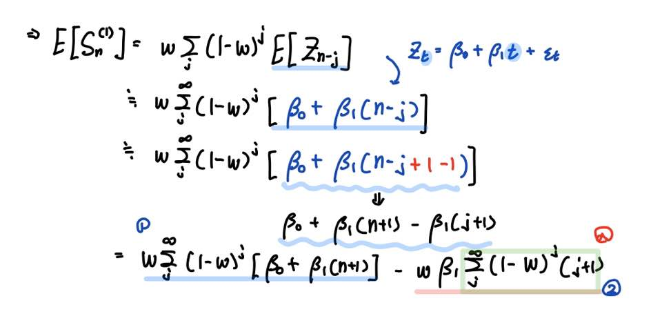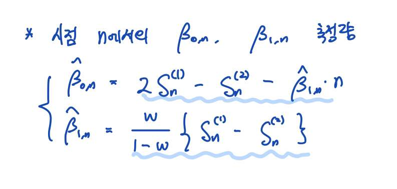 즉 단순지수평활 통계량을 선형 추세를 따르는 시계열 모형에서의 Z_(n+1)의 예측값으로 사용하면 항상 β1/w 만큼의 편향 추정을 하게 되는 문제점이 발생합니다.