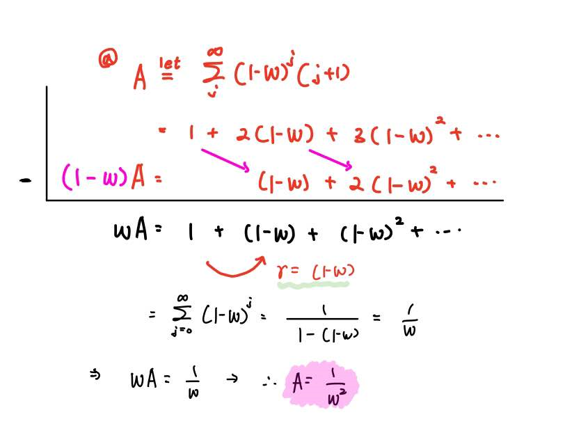 그러면 우변은 공비가 (1-w)인 무한등비급수의 합이 되므로 공식에 따라 구해주면 1/w가 됩니다.