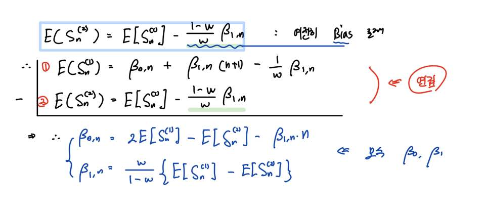 그래서 단순지수평활 통계량의 기댓값과 이중지수평활 통계량의 기댓값을 연립하여 β0, β1에 대해 정리하면 β0, β1에 대한 식을 얻을 수 있습니다.