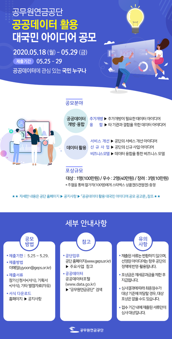 공무원연금공단의 데이터를 이용해서 공단의 서비스를 개선하거나 공단의 신규 사업 아이디어를 제안하는 방식입니다.