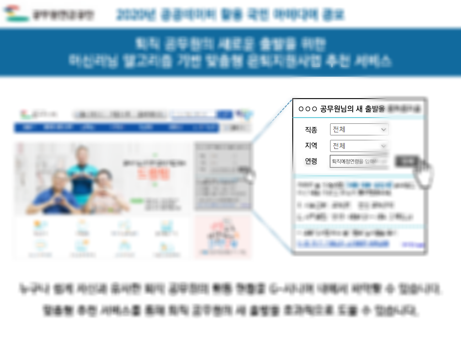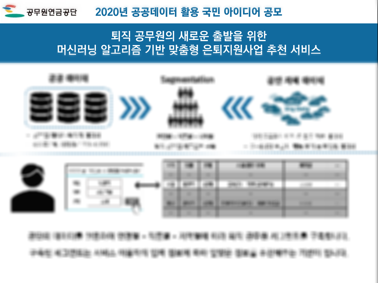 개개인의 특성을 파악해 각 은퇴 공무원에게 최적화된 은퇴지원사업을 추천해주는 서비스를 제안하였습니다.