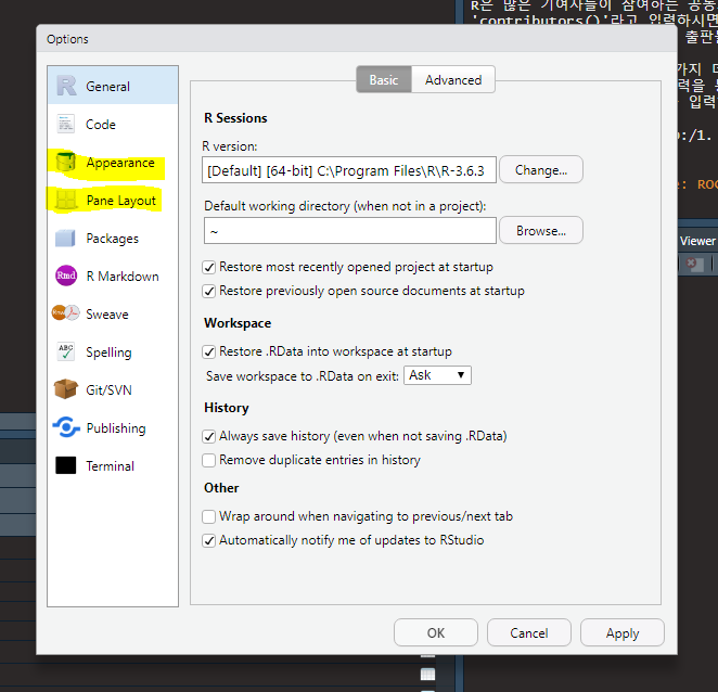 이번에는 설치한 RStudio를 좀 더 본인만의 스타일로 사용할 수 있는 여러가지 옵션에 대해서 설명해볼까 합니다.