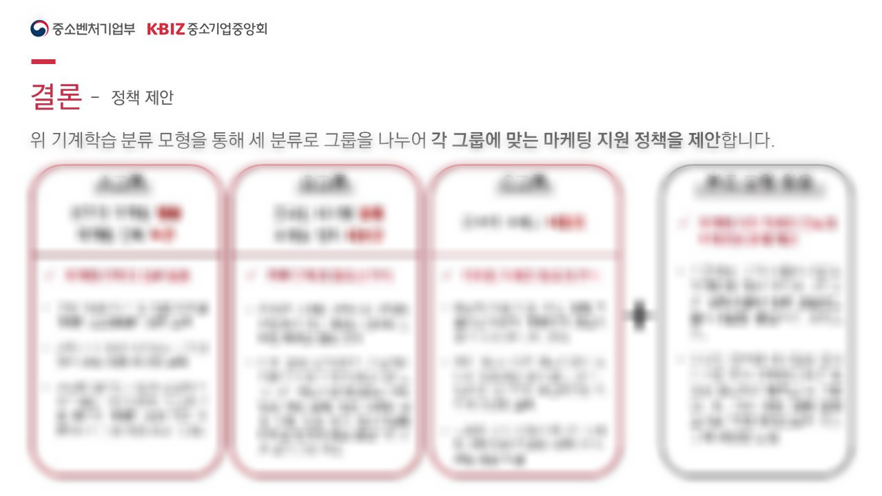 즉 데이터셋에 주어진 8500개의 중소기업만으로 얻어낸 모형을 통해 수많은 서비스업종 중소기업의 마케팅 활용 여부를 예측하고, 예측된 결과에 맞게 지원할 수 있도록 각 그룹에 맞는 지원 정책을 제안하였습니다.