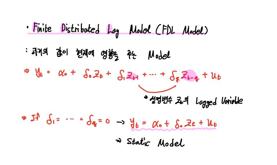 이번 포스팅은 유한개의 설명변수의 Lagged Variable을 이용하여 반응변수 y를 예측하는 모형인 Finite Distributed Lag Model, 줄여서 FDL Model에 대해 다뤄보도록 하겠습니다.